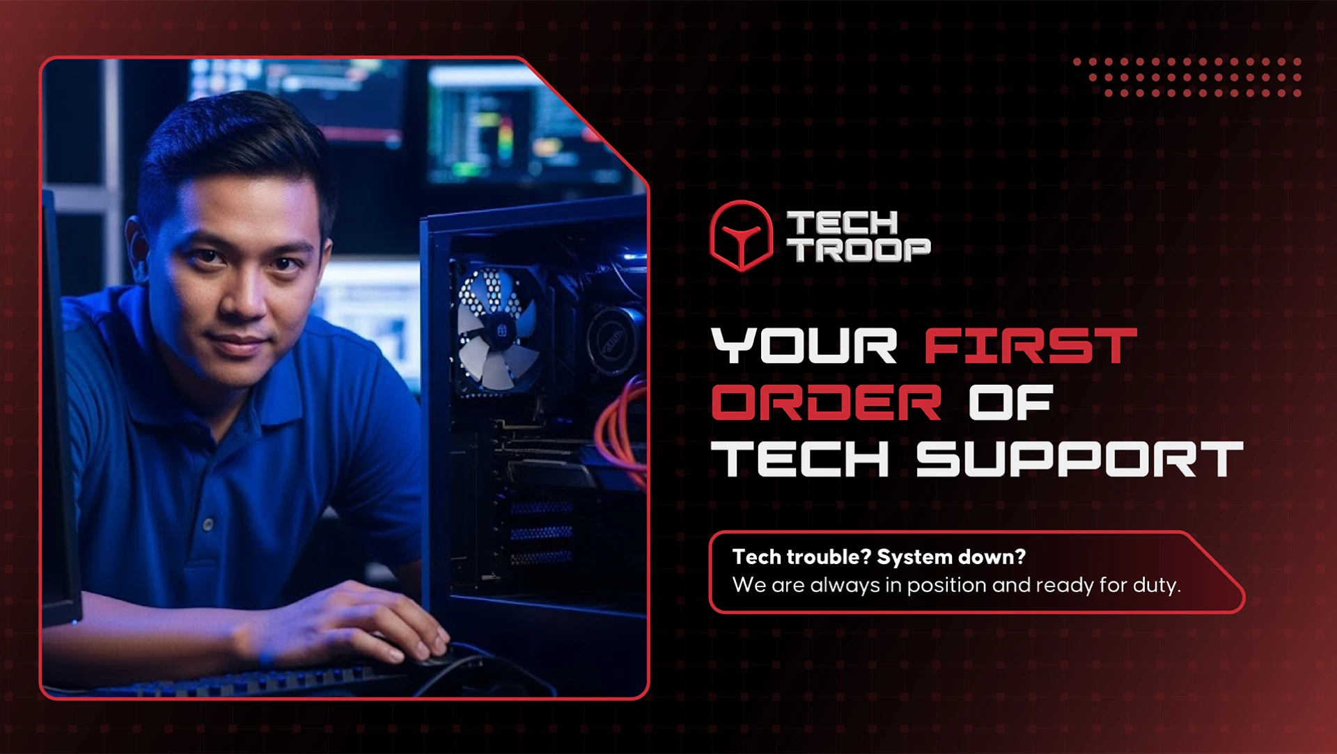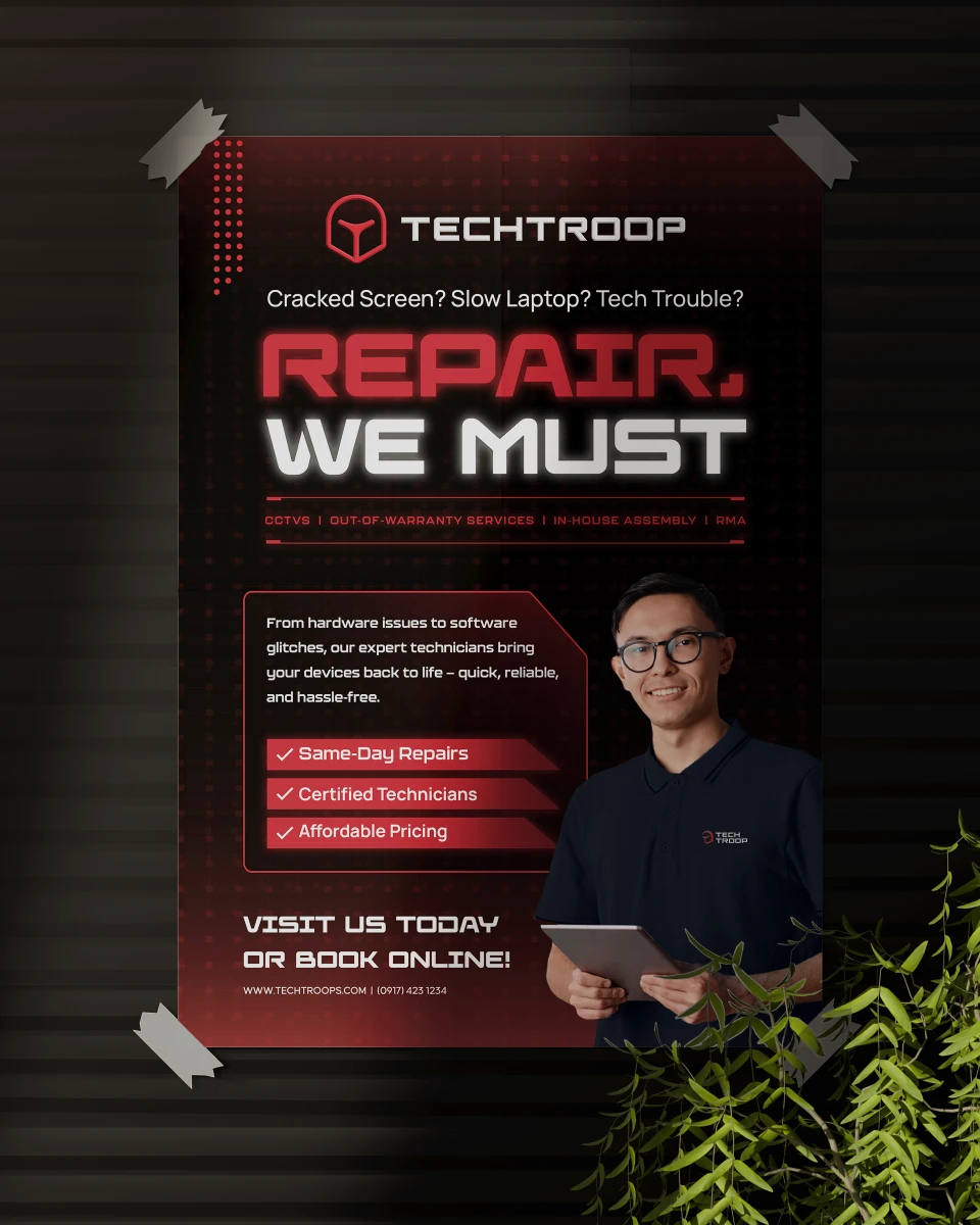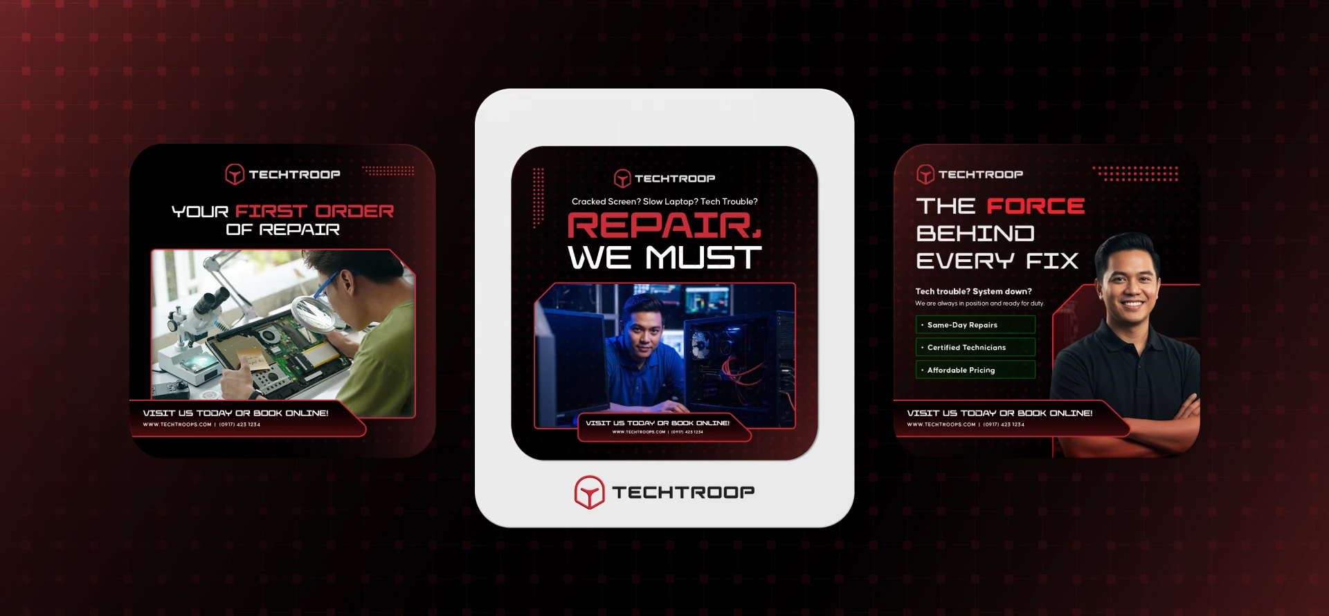 As a tech company that prioritizes working together on precise diagnosis and disciplined repair, we opted for a design inspired by modules on a circuit board that work in synergy. Much like Stormtroopers, Techtroop unites in pursuit of its mission to conquer everyone’s tech support needs, which led to our idea for their tagline: “Your First Order For Tech Support.”